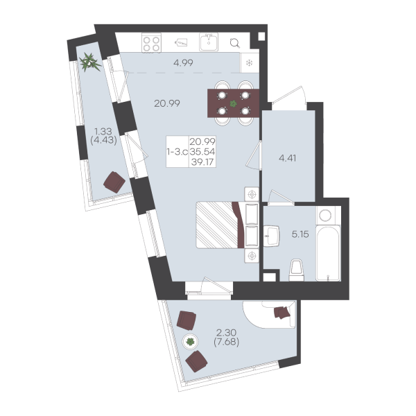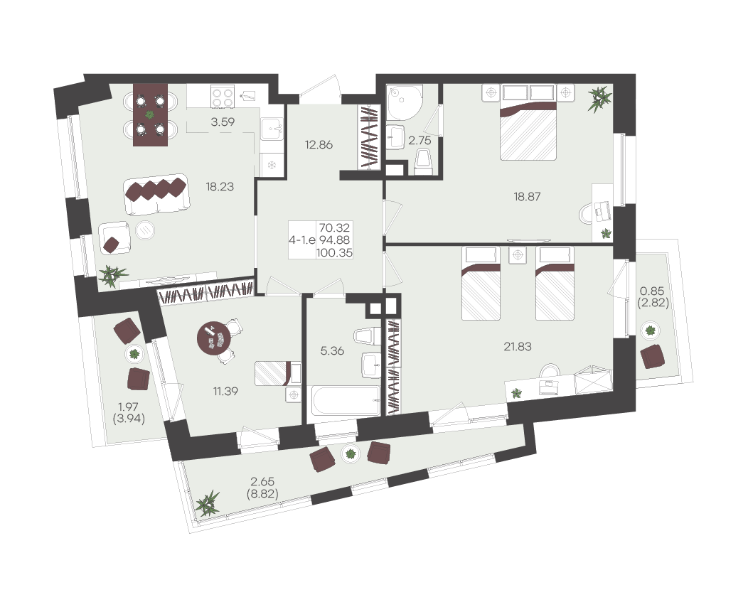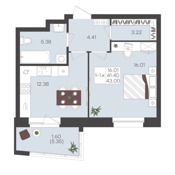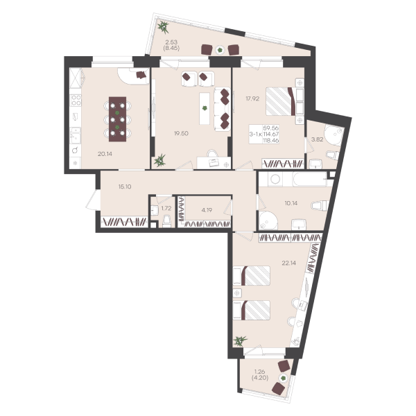 Планировка этой квартиры создана для большой семьи. Просторная прихожая, где легко организовать грамотное хранение. Мастер-спальня с собственной душевой позволяет уединиться и восстановить силы после рабочего дня. А на просторной кухне легко поместятся все близкие для теплых ужинов и семейных торжеств.
